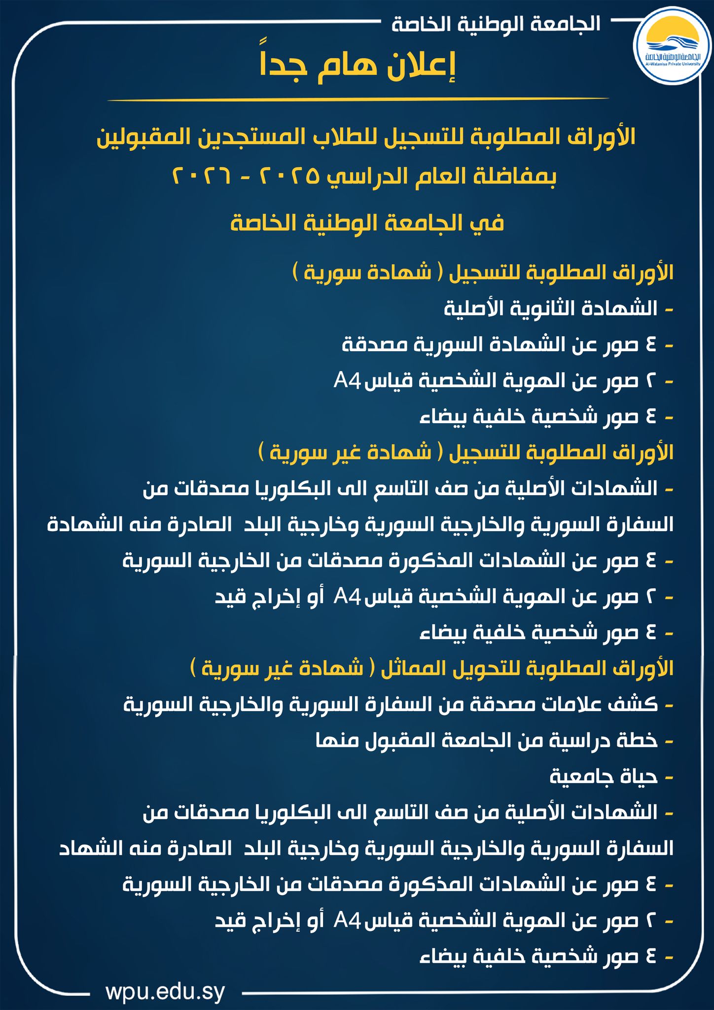 ونحيطكم علماً بأننا سنوافيكم بموعد بدء التسجيل وتقديم الأوراق المطلوبة وموعد التسديد المالي في البنوك المعتمدة ومواعيد انتهاء عمليتي التسجيل والتسديد عبر معرفات الجامعة الوطنية الخاصة على وسائل التواصل الاجتماعي
