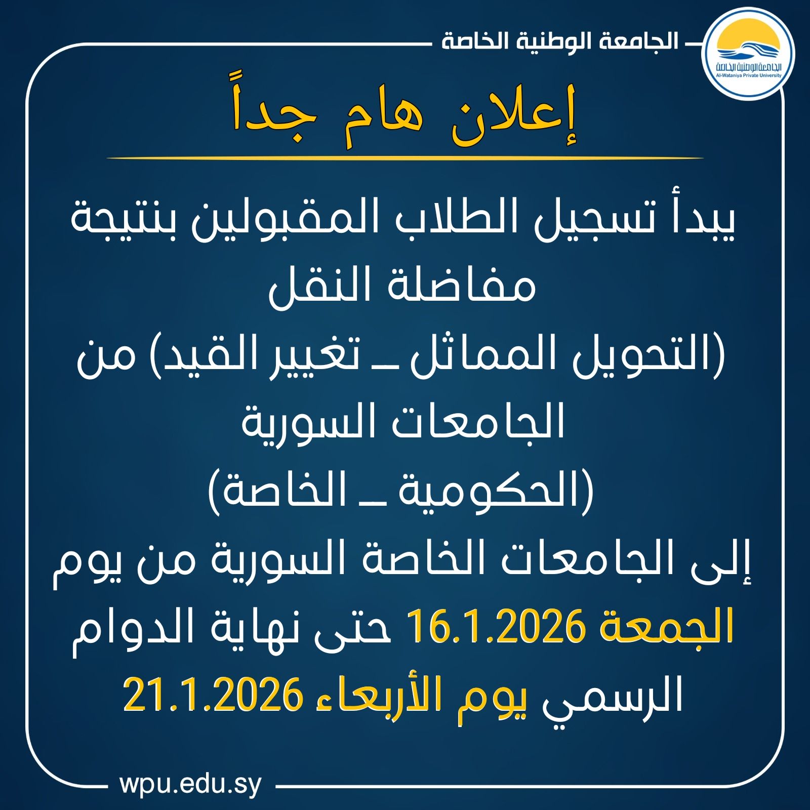 إلى الجامعات الخاصة السورية من يوم الجمعة 16-1-2026 حتى نهاية الدوام الرسمي يوم الأربعاء 21-1-2026