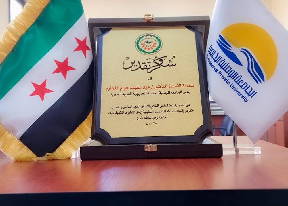 وفي هذا السياق ، شاركت الطالبة إنجي الريجاوي من كلية العلوم الإدارية والمالية ببحث علمي نوعي حملَ عنوان ” دور القيادة الداعمة في تعزيز الصحة التنظيمية ” تحت إشراف أكاديمي مباشر من الدكتور حيان حمدان نائب رئيس الجامعة الوطنية الخاصة للشؤون الإدارية وشؤون الطلاب ، والذي تم قبوله من أصل 220 بحث علمي مشارك ليكون بذلك من ضمن الأبحاث العلمية المقبولة والتي بلغ عددها نحو 60 بحث علمي مشارك من مختلف الدول وذلك ضمن أربع محاور رئيسية : الإبداع والابتكار العملي، والبحث العلمي في العلوم الإنسانية، والتوجهات الحديثة في تكنولوجيا المعلومات، والإبداع الفني والأدبي ، لتصبح بذلك الجامعة الوطنية الخاصة أولى الجامعات السورية المُشاركة في هذه القمة العربية الإبداعية .