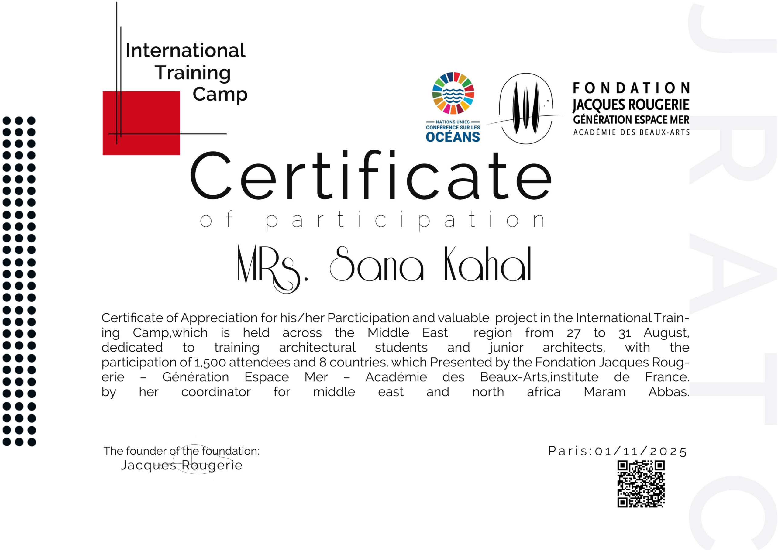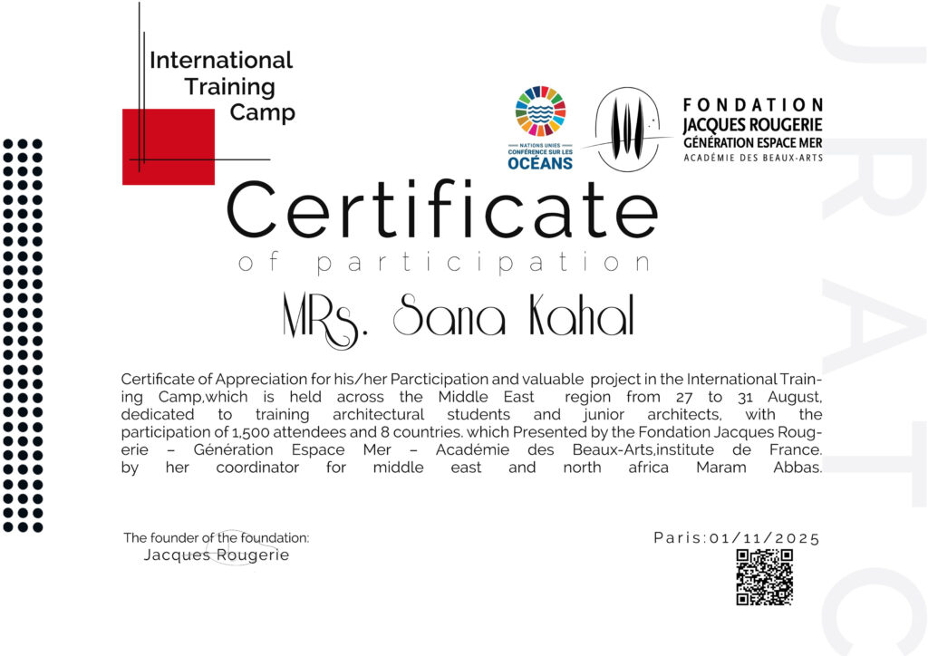 شاركت الطالبة سنى محمد كحال من طلاب كلية هندسة العمارة والتخطيط العمراني في الجامعة الوطنية الخاصة في مخيم التدريب الدولي International Training Camp الذي أقامته مؤسسة Jacques Roguerie التابعة لأكاديمية الفنون الجميلة في فرنسا .