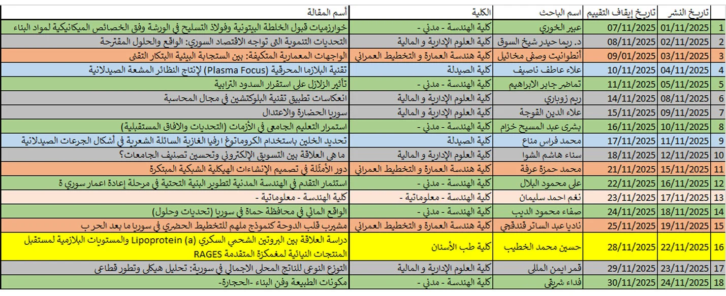 تنطلق اليوم مسابقة أفضل مقالة علمية باصدارها الثاني حيث سيتم نشر المقالات العلمية بحسب ترتيب وصولها مع اتاحة الفرصة للتقيم و التصويت على جودة المقالة و نذكر يأن فترة استقبال المقالات العلمية قد تم تمديدها لنهاية الشهر الحالي للراغبين من السادة الباحثين (في الجامعة الوطنية الخاصة حصراً ) في المشاركة في المسابقة وفق الشروط التي تم الاعلان عنها في مقال سابق وفيما يلي القائمة لخاصة بالمقالات و الجدول الزمني المرفق بها :