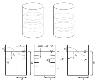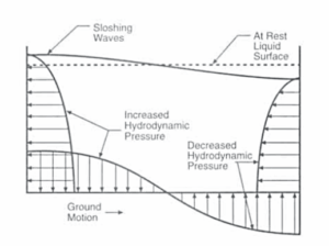 أثناء الهزة الأرضية يتعرض السائل الموجود ضمن حوض الخزان للحركة والاهتزاز بعدة أنماط، والشكل (20) يوضح بعض أنماطها، حيث تهتز الكتلة العلوية من السائل وتنشأ الأمواج في السطح الحر منه، وتضطرب هذه الأمواج وترتفع بحسب شدة الهزة الأرضية ومدتها، كما أنّ لنسبة امتلاء حوض الخزان واتساع السطح الحر للسائل وقيمة قطر حوض الخزان دوراً كبيراً في مدى ارتفاع الأمواج.