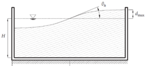 ومن الضروري تحديد ارتفاع الأمواج المحتمل الوصول إليه كما في الشكل (21)، [2]، ليتم تحديد ارتفاع بلاطة سقف حوض الخزان، أي المجال الحر بين السائل وسقف الحوض، وهذا الأمر هام جداً في حالة الخزانات الحاوية على سوائل سامة حيث يجب الحيلولة دون تسريبها، وفي حال كان ارتفاع بلاطة سقف الخزان غير كافي يجب تصميم البلاطة لتقاوم الضغط الناتج عن دفع أمواج السائل المتشكلة بسبب الهزة الأرضية.
