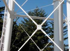 يمكن زيادة استقرار وأمان الجملة الحاملة للخزانات العالية المؤلفة من أعمدة ونواة أثناء الزلزال عن طريق ربط الأعمدة والنواة ببلاطة دائرية بيتونية مسلحة مع جائز حلقي ring beam and slab ضمن مستوي واحد أو أكثر وذلك بحسب ارتفاع الخزان، أو بجوائز محيطية وقطرية radial and circumferential beams دون بلاطات للجمل الإطارية. هذا الإجراء يؤدي لانخفاض في قيم الاستجابة الديناميكية متمثلةً بقيم كلٍ من الإزاحة الأعظمية وقوة القص القاعدي وعزم الانقلاب التي تؤثر على الخزانات العالية أثناء الزلزال، والشكل (23) يوضح خزانات عالية مزودة بجوائز رابطة.