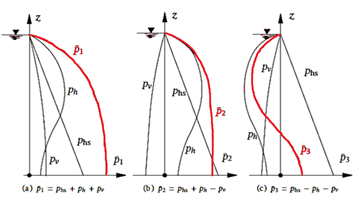 الشكل (4): أنماط مختلفة لتوزع الضغط الهيدروستاتيكي والضغط الناتج عن مركبات الزلزال، [2].