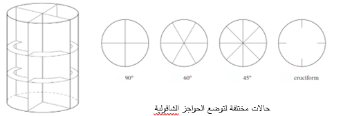 3. قد توضع حواجز متعددة مؤلفة من حلقات أفقية وصفائح شاقولية، وبعدة وضعيات كما هو واضح بالشكل (26)، [2].
