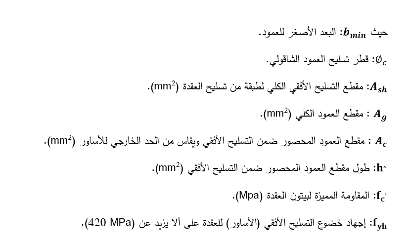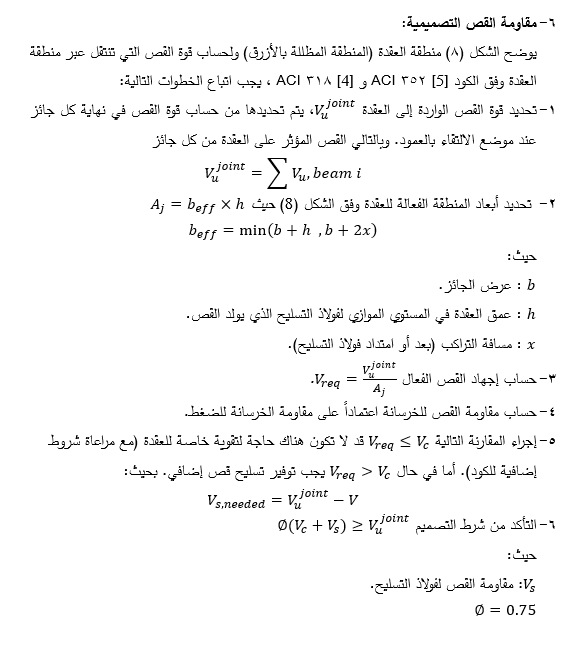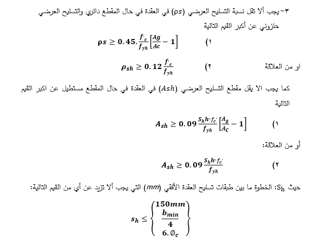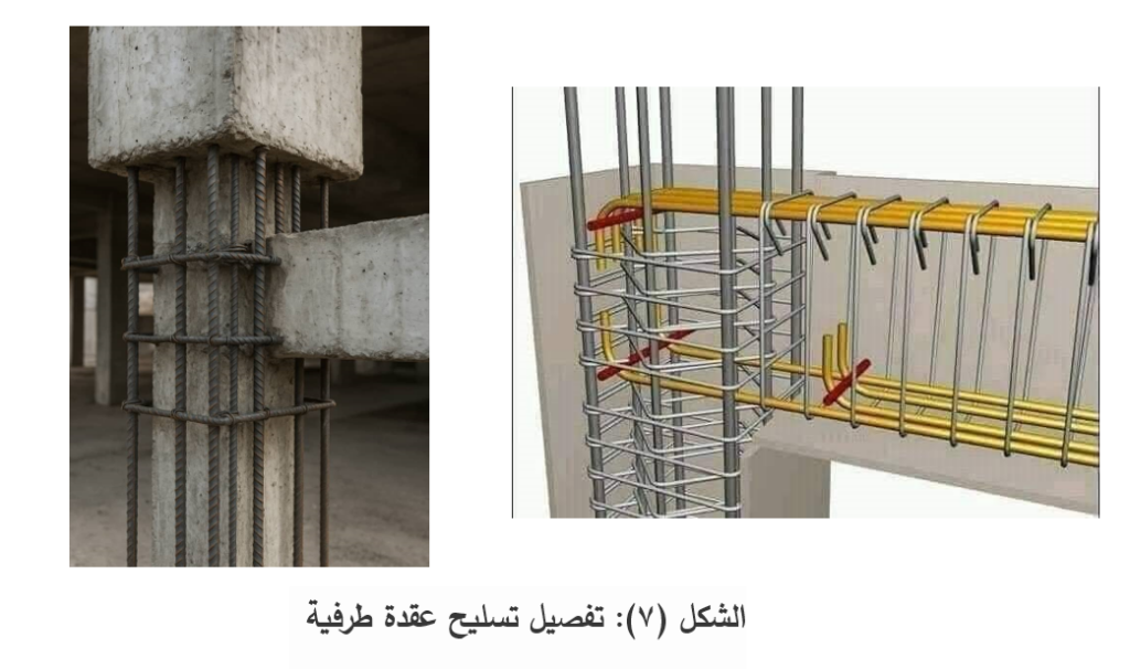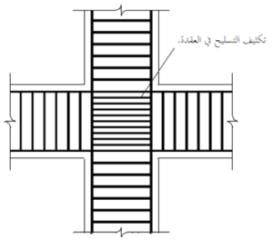 إن تشكل الضغط والشد القطريين وإجهادات القص الديناميكية المنعكسة الاتجاه تسبب تفتتاً سريعاً لبيتون العقدة مما يؤدي إلى فقدان العمود وظيفته في حمل الأحمال الشاقولية، كما تفقد قضبان تسليح الأعمدة والجوائز تماسكها مع البيتون. لذا يجب تسليح العقدة بأساور أفقية مغلقة بغية تطويق العقدة والحفاظ على بيتونها ضد التفتت انظر الشكل (5)، مع مراعاة أن هذه الأساور والشناكل يجب أن تحقق متطلبات الشكل (6). والشكل (7) يوضح كيفية تنفيذ وربط تسليح العمود مع الجائز (منطقة العقدة).