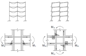أما في حالة الإطار الخاضع الحمولات أفقية (زلزالية) فإن العزمين الذين يتشكلان في الجائزين على طرفي عقدة داخلية لهما اتجاه دوران واحد، لكن أحدهما موجب شد التسليح السفلي والآخر سالب شد التسليح العلوي) في الفتحة المقابلة للجائز، وبالتالي تكون قضبان التسليح العلوي للجائز خاضعة إلى قوى شادة في أحد أطراف العقدة وقوى ضاغطة في الطرف الآخر لها، كما هو مبين بالشكل (3) أما قضبان التسليح السفلي للجائز فتكون خاضعة إلى قوى مماثلة لقضبان التسليح العلوي ولكن باتجاه معاكس وبنفس المناقشة السابقة على العمودين العلوي والسفلي يمكننا أن نستنتج أنها تخضع لقوى مشابهة في التسليح لما تخضع له قضبان تسليح الجوائز، ولهذا ينتج عن مجموعة القوى السابقة حزمة ضغط قطرية تنحصر بين مناطق الضغط الأربع في الجوائز والأعمدة، ويقابلها في الاتجاه القطري الثاني للعقدة قوى شد مرتفعة والتي سرعان ما تسبب التشققات.[2]